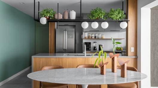 • Conceito Aberto (Open Concept): A integração entre cozinha, sala de estar e sala de jantar continua em alta, promovendo a convivência e a sensação de amplitude. Ilhas de cozinha se tornam o coração da casa, funcionando como espaço de preparo, refeições informais e trabalho. Varandas que se estendem aos ambientes internos ampliam ainda mais essa integração.