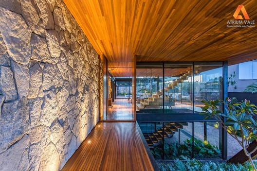 Interior com pedra e madeira — a combinação de materiais naturais cria uma atmosfera única e atemporal.